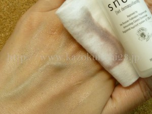 ミルクタイプのクレンジングということでどこまで落とせるか実際に試してみました。左からウォータープルーフのアイライナーリキッド・アイライナーペンシル・アイシャドー・口紅です。ふきとりタイプのクレンジングなので、最後にはコットンを使ってふき取ってみました。キラキラとラメは残っていますが、ウォータープルーフのアイライナーまですっきり落とすことができました。スノーヴァ ミルククレンジング恐るべし。