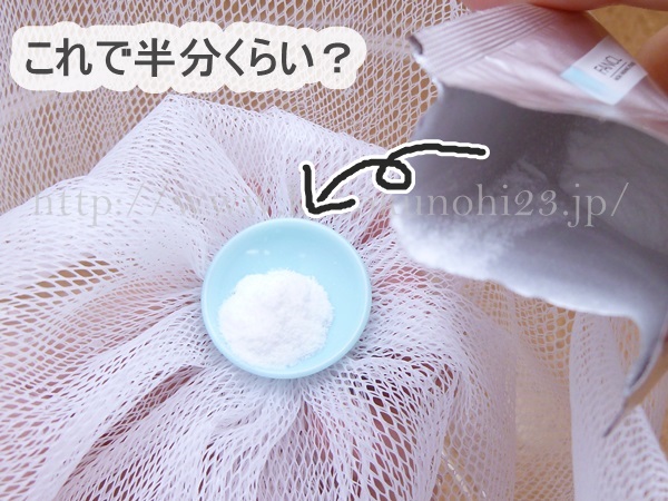 洗顔パウダーをこぼさないように気をつけながら、泡立てていきます。泡立てネットをあらかじめ洗ってあったのですが、少し乾いてきたので水を追加。