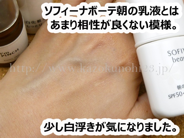 ソフィーナボーテとは相性があわないようで、日焼け止めがあまり上手になじまず白浮きしてしまいました。単体では塗りすぎてもテカるぐらいの問題点しかなかったので、相性が良くないと捉えることにします。