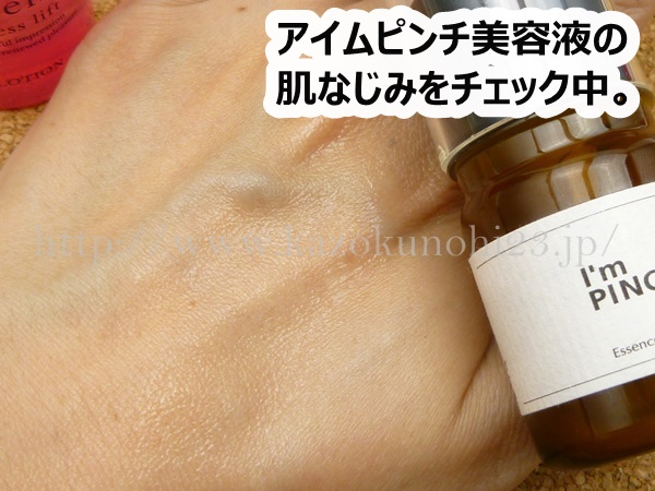 初めて使ったアイムピンチ美容液は、穏やかに肌になじむタイプの美容液でした。すーっとするわけでもなく、ゆっくりと肌になじむ感じを楽しみました。自分の手持ち化粧品と合わせて使うことができる点も◎