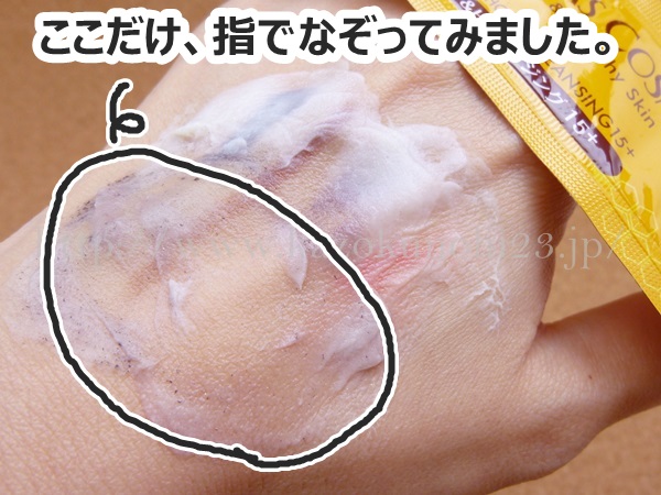 「マッサージする要領で肌全体にのばし、マッサージの要領で肌になじませ、ポロポロがでてきたら洗い流す」とあったのですが、白濁した時点でやめました。全身用ということで、角質がたっぷりの部分はポロポロもよくでるのかもしれません。