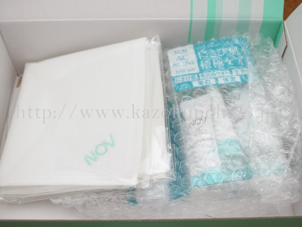 ハンドタオル入りのノブACアクティブお試しセット。箱にプチプチで包まれて、届きました。