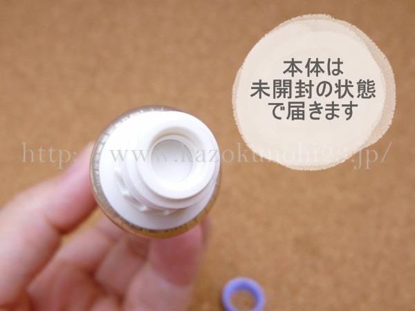 キャップと本体の間に挟まっている青いリングを外します。その後、キャップをぎゅっと締めます。「カチッ」と「パチっ」の間ぐらいの鈍い振動がしたら、使う準備OK。