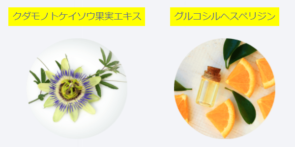 左のクダモノトケイソウと言うのは、パッションフルーツのことなので、パッションフルーツに含まれているエキス、グリコシルヘスペリジンは、柑橘系の皮に多く含まれている成分だそう。